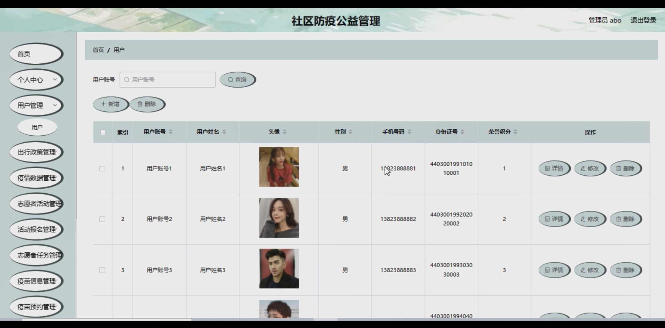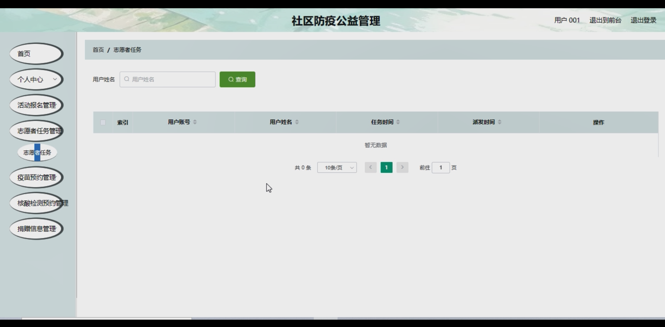 | 用户,志愿者活动,活动报名,志愿者任务,疫情数据,疫苗信息,疫苗预约,核酸检测预约,出行政策,募捐信息,捐赠信息,外来人员登记 |