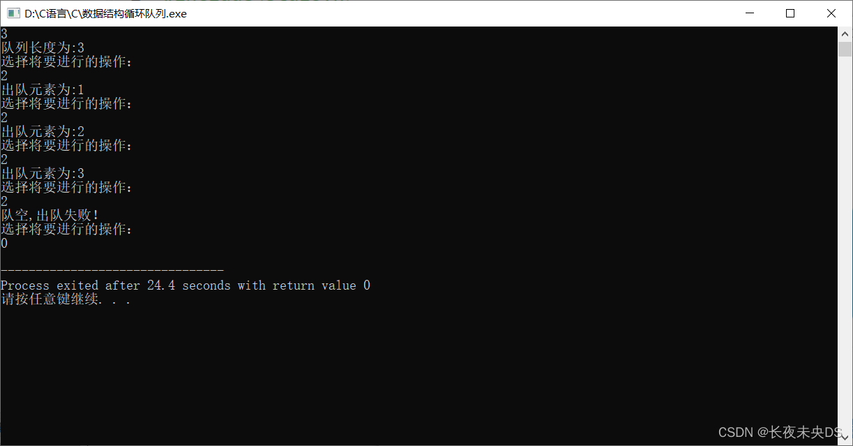 printf("1 入队,2 出队,3 求队列长度,按其他结束\n");