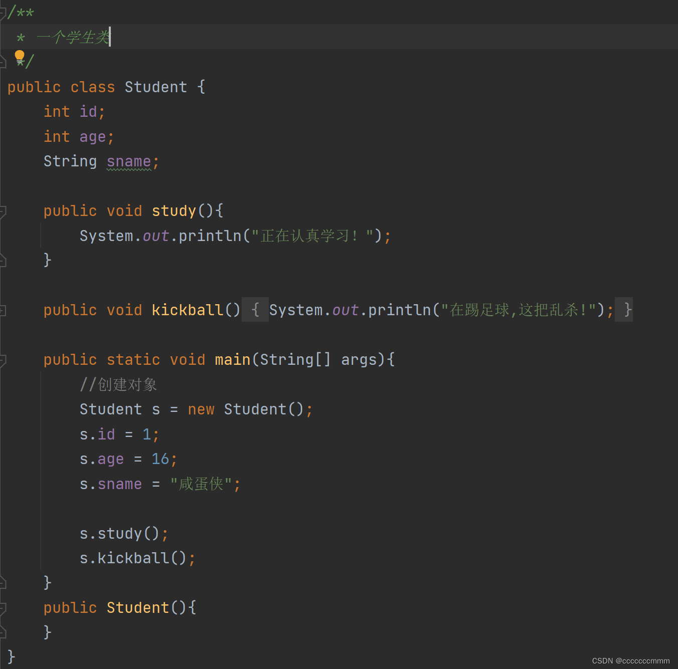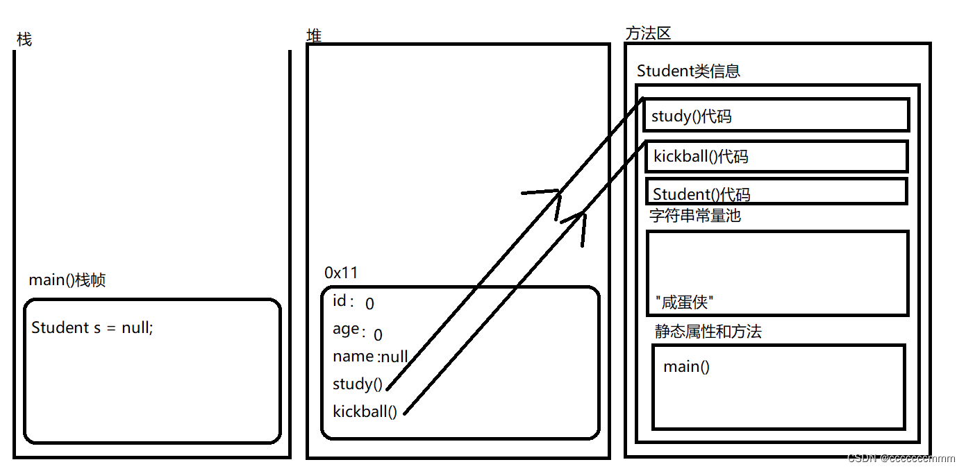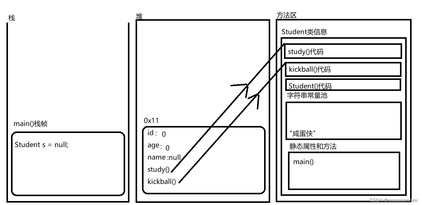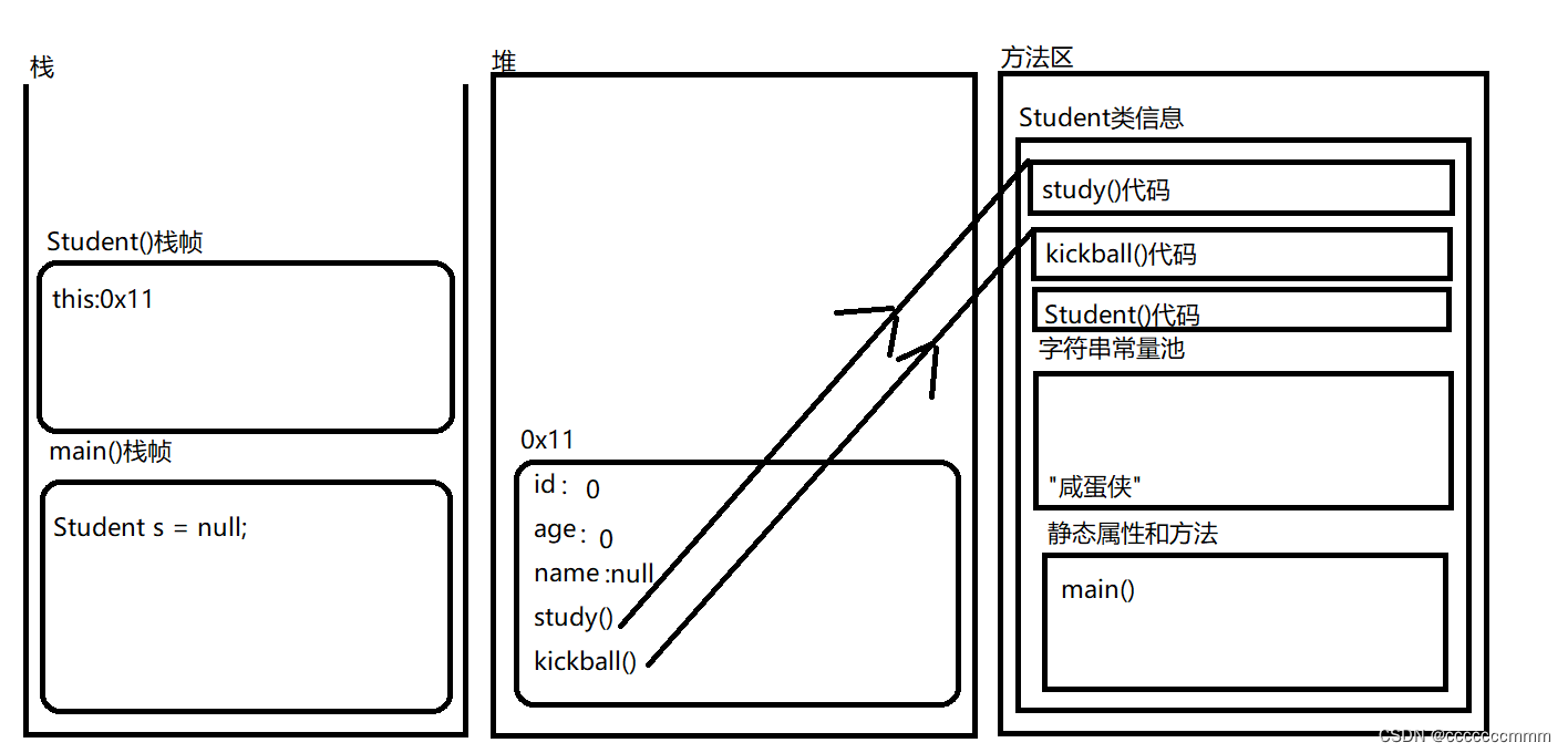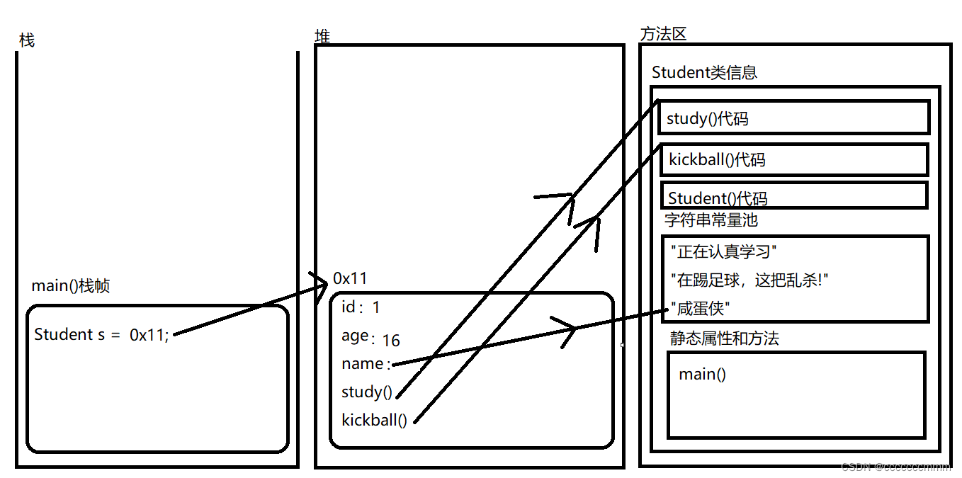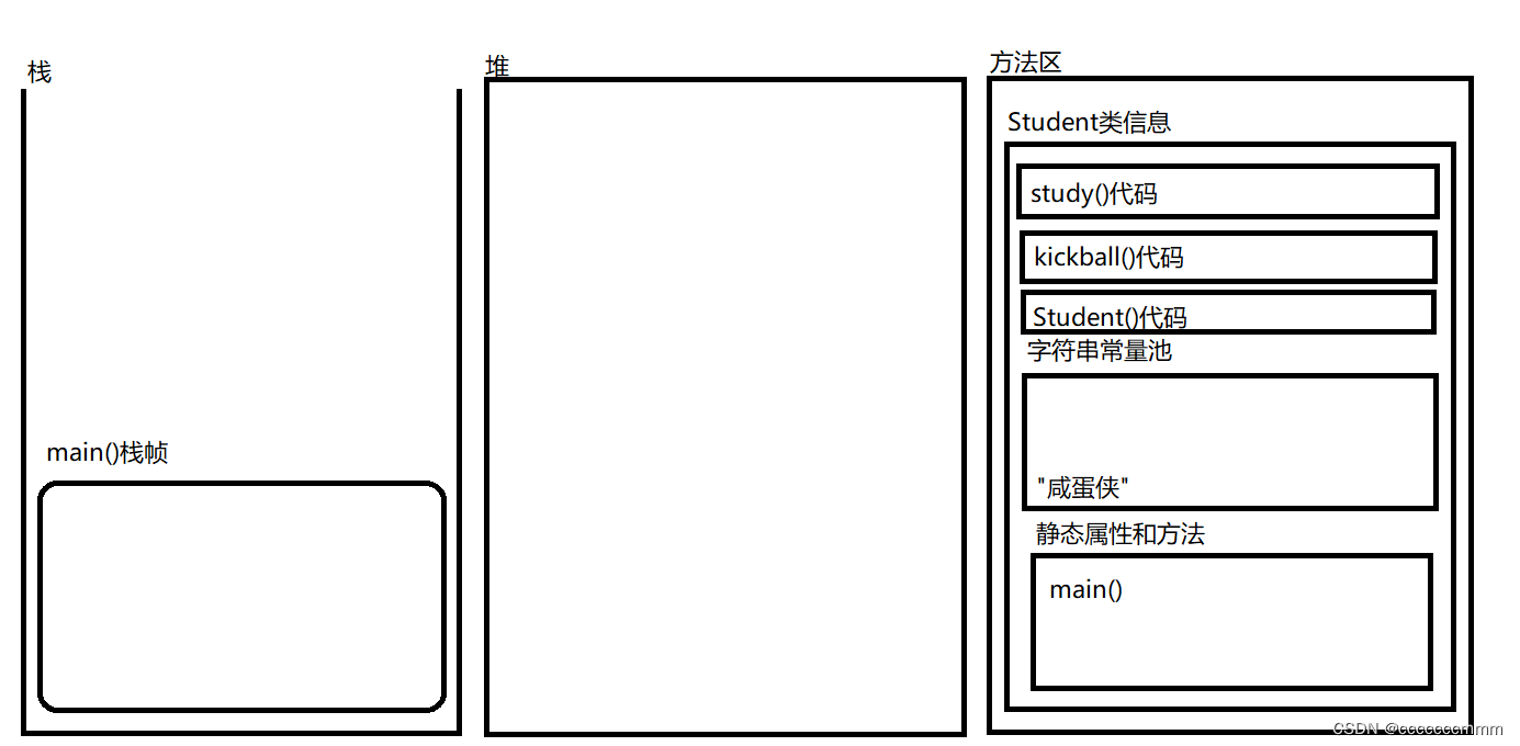 首先第一步,我们先加载类信息,类信息是在方法区里边执行的,而每一个类信息都有字符串常量池,静态属性和方法区,至于为什么还有方法的代码就是因为每次创建一个对象如果对复制一份study()代码,kickball()代码,Student()代码这样子就过于浪费空间了: