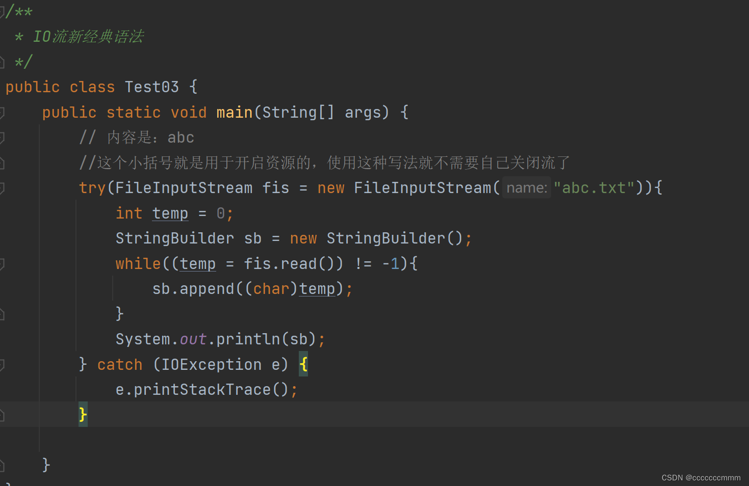 但是大家也看到了,通过这种方法操作IO流会发现,程序非常的臃肿,整段代码的核心只有一个就是这一段