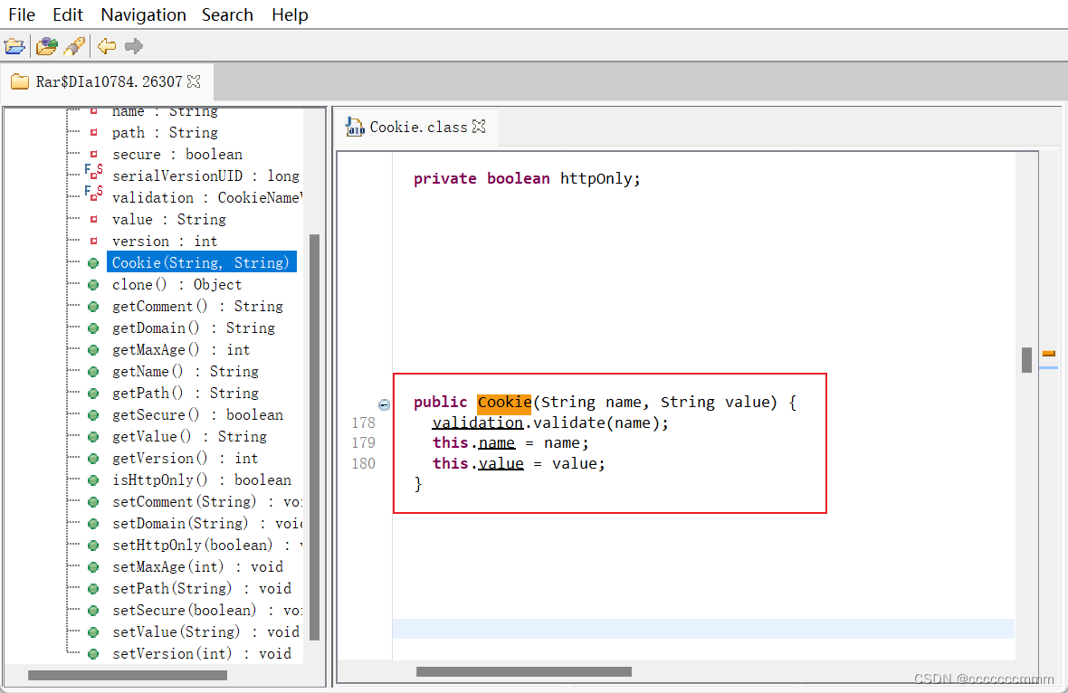 通过Cookie对象的源码发现,可以直接通过new关键字创建Cookie对象,并且需要两个参数