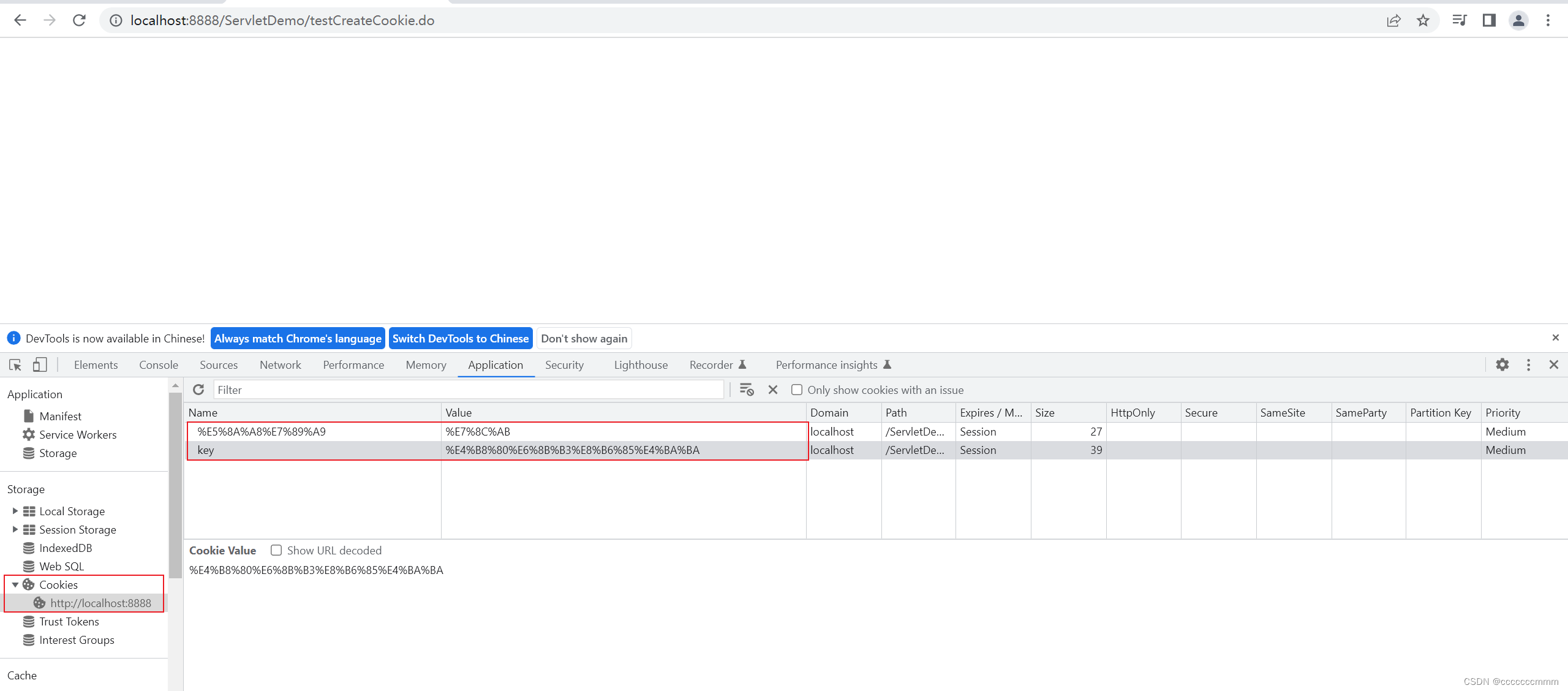 这时候我们再去创建Cookie对象我们通过开发工具查看Cookie的name与value,这时我们会发现中文部分的name和value都是一些16进制数字,