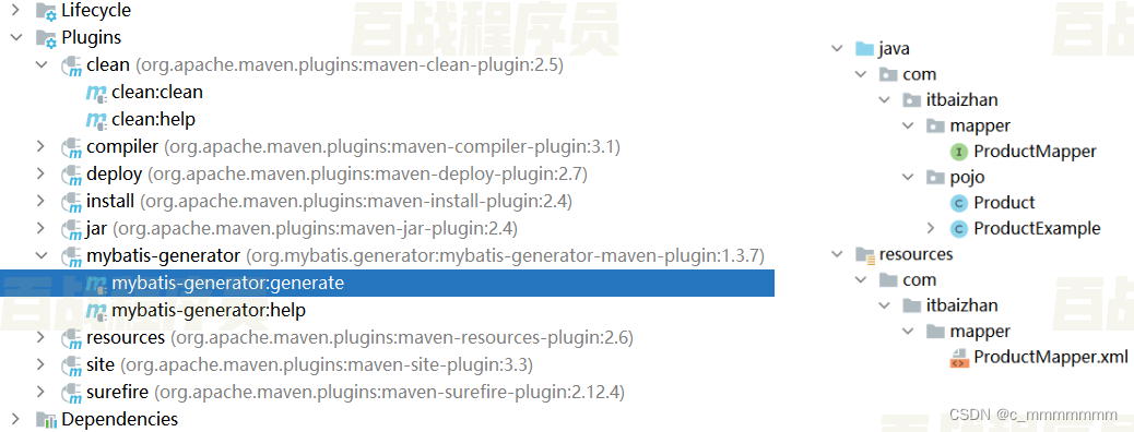 - 运行插件,自动生成POJO,持久层接口,映射文件: