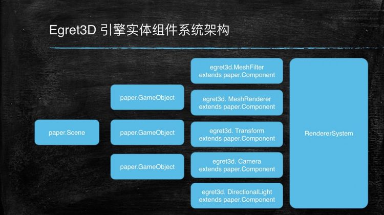运行时库的第一部分是实习组件系统架构。Egret3D中包含了两个命名空间,分别是 paper和egret3d。为什么有这样区别呢?开发者可以这样简单理解,所有与实体组件系统架构相关的API,我们放在paper命名空间内,因为这些内容是与3D渲染无关的,这样在未来,我们会把与Egret2D相关的内容也集成到这个实体组件系统的架构中。白鹭引擎2D、3D作为整体来支持。