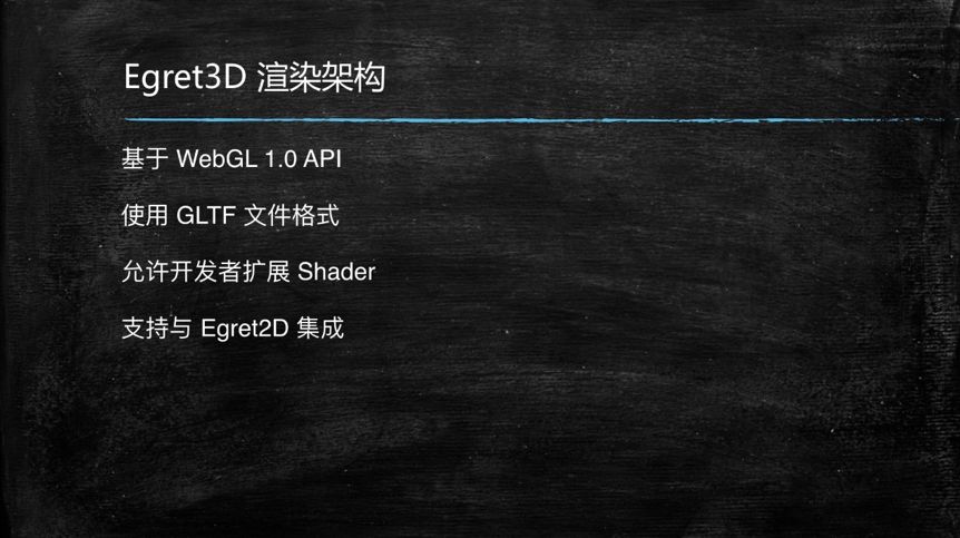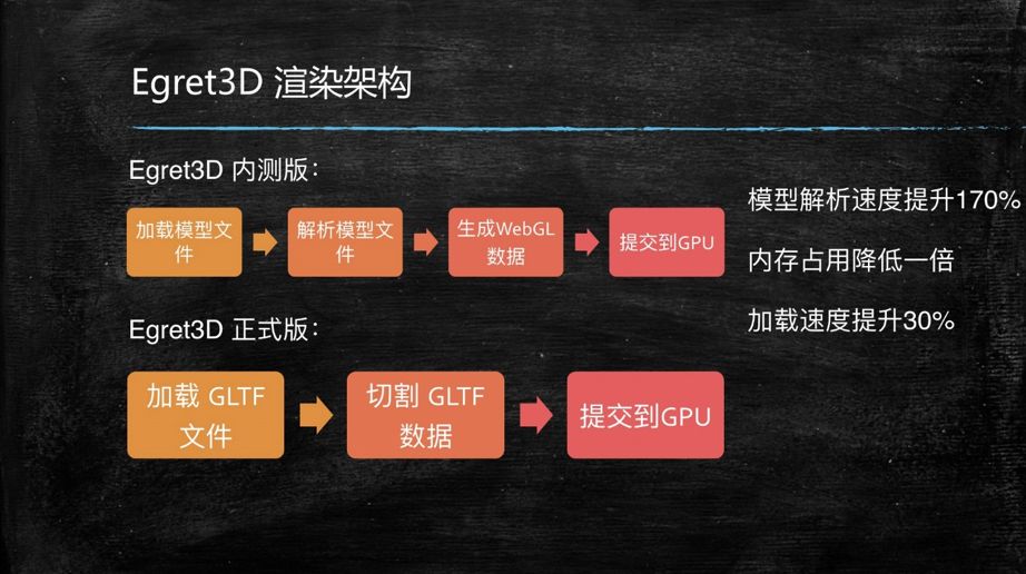 在一款3D游戏中,需要大量的模型资源与配置资源,Egret3D使用 GLTF 这一标准格式。这种格式有个非常好的优点是,它是为OpenGL/WebGL接口而设计的格式,因此底层的解析效率会非常高。我举一个实际的例子,Egret3D在去年发布了内测版本,他的具体模型解析流程是这样的:第一步需要加载一个模型文件,然后将模型文件进行解析,然后生成WebGL所需要的数据格式,最后提交到GPU中,这样才是一个完整的过程。接下来我们看看今年发布的 Egret3D正式版的架构。我们现在添加的模型文件是一个 GLTF格式文件,这种格式在加载后无需进行解析和生成,只需要对其进行一个非常简单的切割,就可以将它的数据直接上传到 GPU 中。大家会发现,解析模型和生成WebGL数据这两个非常耗时的操作被直接绕过去了。实现了从浏览器加载到提交数据之间的无缝对接,通过这种设计,Egret3D与去年的内测版相比,模型解析速度提升了170%,内存降低了一倍,用户可以感知到的加载速度也提升了30%。