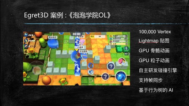 然后具体实际案例可以看看白鹭Egret3D的案例,《泡泡学园OL》。这款游戏的开发手段就是我刚才说的那样,使用 Unity3D 制作模型,然后在 Egret3D 编辑器中进行二次编辑,主要是挂载组件,以及调整数值和场景。这个游戏我们已经发布了小游戏版本,其中一些性能指标基本是目前Egret3D能发布到微信小游戏的极限,其中 Vertex数据可以更高一些,由于这款游戏包含了比较复杂的使用CPU计算的碰撞引擎和行为树AI,所以我们牺牲了部分Vertex来换取更高的性能。开发者如果做的游戏不需要这些高级功能,Vertex可以提升到200,000以上。