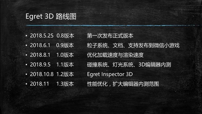 刚才跟大家介绍是Egret3D的整个发展情况,我们回顾一下我们今年的整体版本发布计划。我们在今年5月份的时候第一次发布了白鹭引擎3D的正式版本,然后接下来发布了0.9版本,支持微信小游戏版本,1.0版本是系统优化,在1.1版本的时候,3D引擎编辑器提供了内测,在10月8号的时候,过了十一之后发了1.2版本,目前最高的版本,我们发布了Egret Inspector 3D提升开发效率,并扩大了3D的编辑器的内测方位。会在2018年11月份发布1.3版本,我们会进一步扩大编辑器的内测范围,并对底层性能和效果,特别是灯光方面进行进一步的完善。