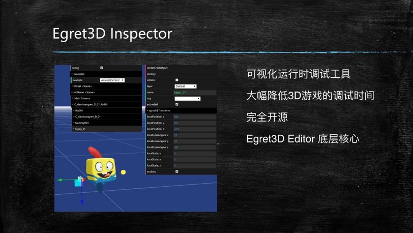 除了编辑器之外,我们还提供了一款开源的名为 Egret3D Inspector的工具用于提升开发者的开发效率。这个工具是 Egret3D编辑器的核心构成,可以在游戏运行时直接显示游戏每一个对象的属性,并在预览模式下对其数值进行调整。通过这种方式,哪怕您没有 Egret3D编辑器,也可以通过这款工具提升游戏的开发效率。