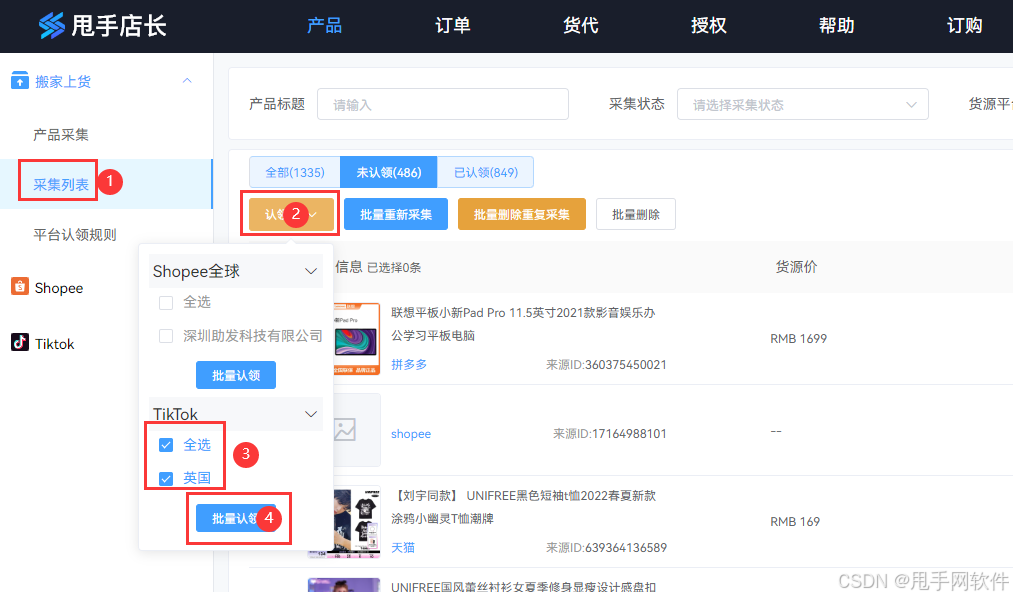 - 采集完成后,点击【采集列表】,勾选商品,认领到需要上货的小店。