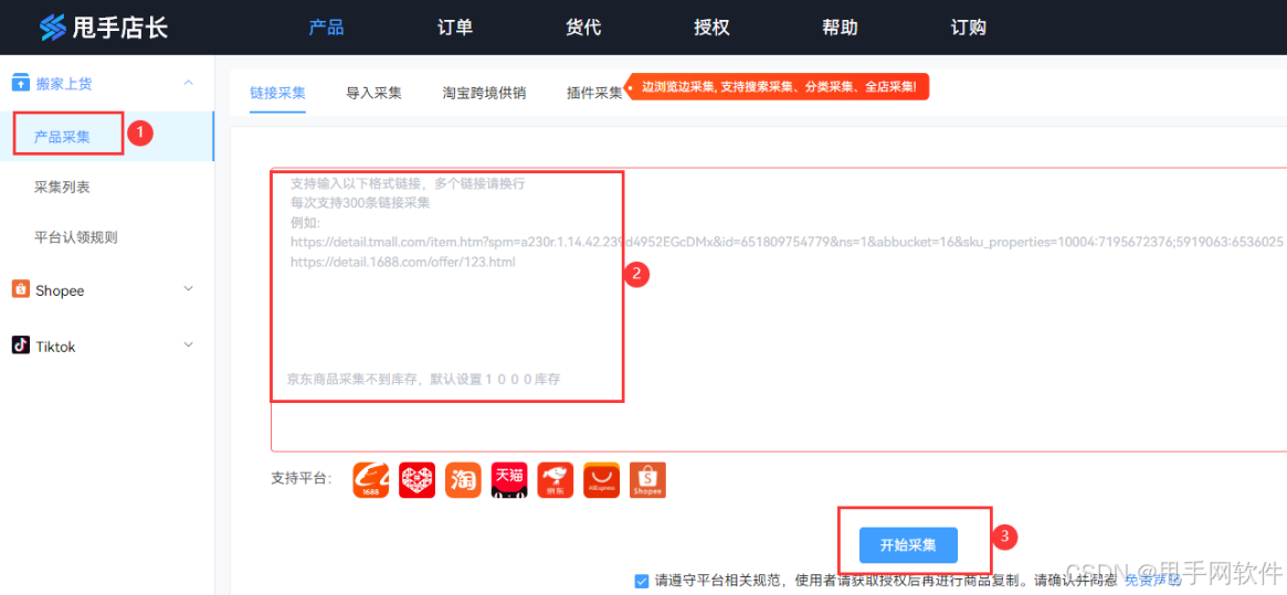 - 点击【产品采集】,在采集输入框内输入商品详情链接,单次支持输入300条。点击【开始采集】