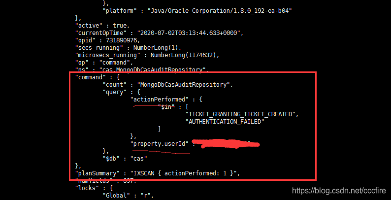 - 自己模拟客户操作做了一次查询,然后在mongo执行 db.currentOp()查询当前操作,下图可分析到,当前操作已查询包括两个条件,但是只给一个条件加了索引,然后执行db.xxx.getIndexes();查看当前的索引,果然如此、