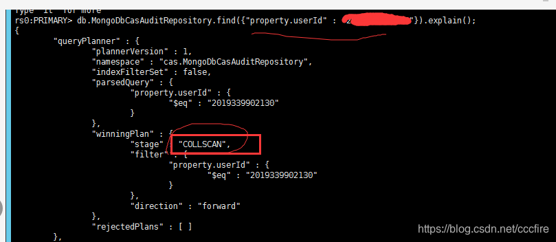 - 后来自己又做了一个验证 db.xxx.find({property.useId:22222}).explain();下图可看到该条件进行了全表的扫描。