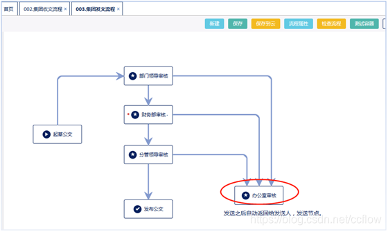 办公室审批节点,在每个部门审批后,都有可能被办公室在审批一遍,办公室这个节点在审批后就会自动的反馈给发送人与发送节点,我们把这样的节点,称为发送返回节点。