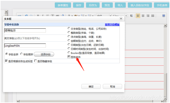 - 签批组件实际上是审核组件的一个特殊的展现形式,是按照“字段”来展现的。这个字段就是签批组件。