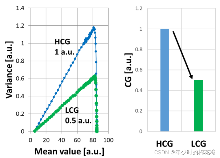 在双转换增益的像素中,光子转换曲线(PTC)及对应的转换增益对比如下: