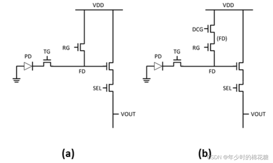 普通单转换增益的像素内部设计和双转换增益的像素内部设计如下: