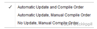 从“源”窗口的“编译顺序”选项卡中,拖放文件以安排编译顺序,或使用菜单“上移”或“下移”命令。其他选项可从“层次更新”上下文菜单中获得,如下所示图形