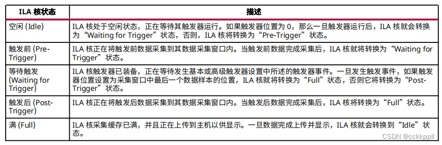 “Hardware”窗口的“Status”列可指示每个 ILA 核的当前状态(请参阅下表)。