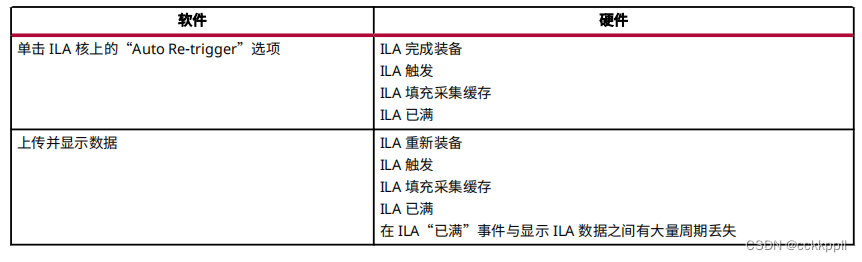 下表显示了调用“Auto Re-Trigger”选项时 Vivado IDE 运行时软件与硬件之间的交互。