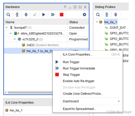 • “Run Trigger Immediate”:选择要装备的 ILA 核,然后单击“ILA Dashboard”或“Hardware”窗口工具栏上的