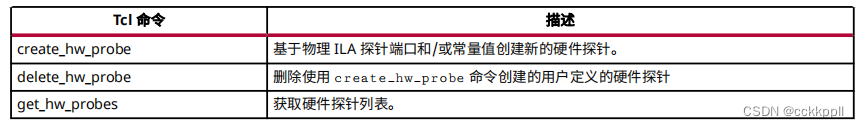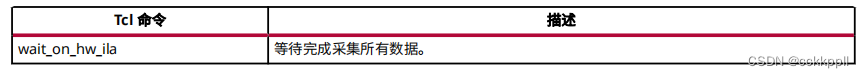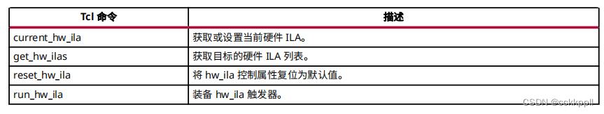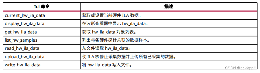 下表包含用于与采集的 ILA 数据进行交互的所有 Tcl 命令的描述。