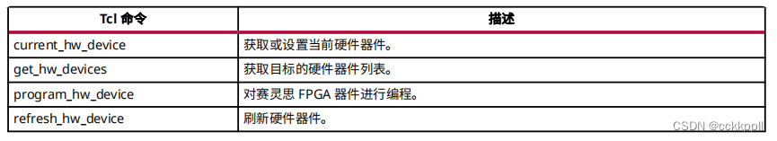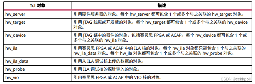 下表包含用于与硬件目标进行交互的所有 Tcl 命令的描述。