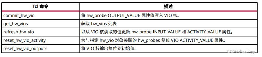 下表包含用于与 VIO 核进行交互的所有 Tcl 命令的描述。