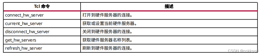 下表包含用于与硬件服务器进行交互的所有 Tcl 命令的描述。