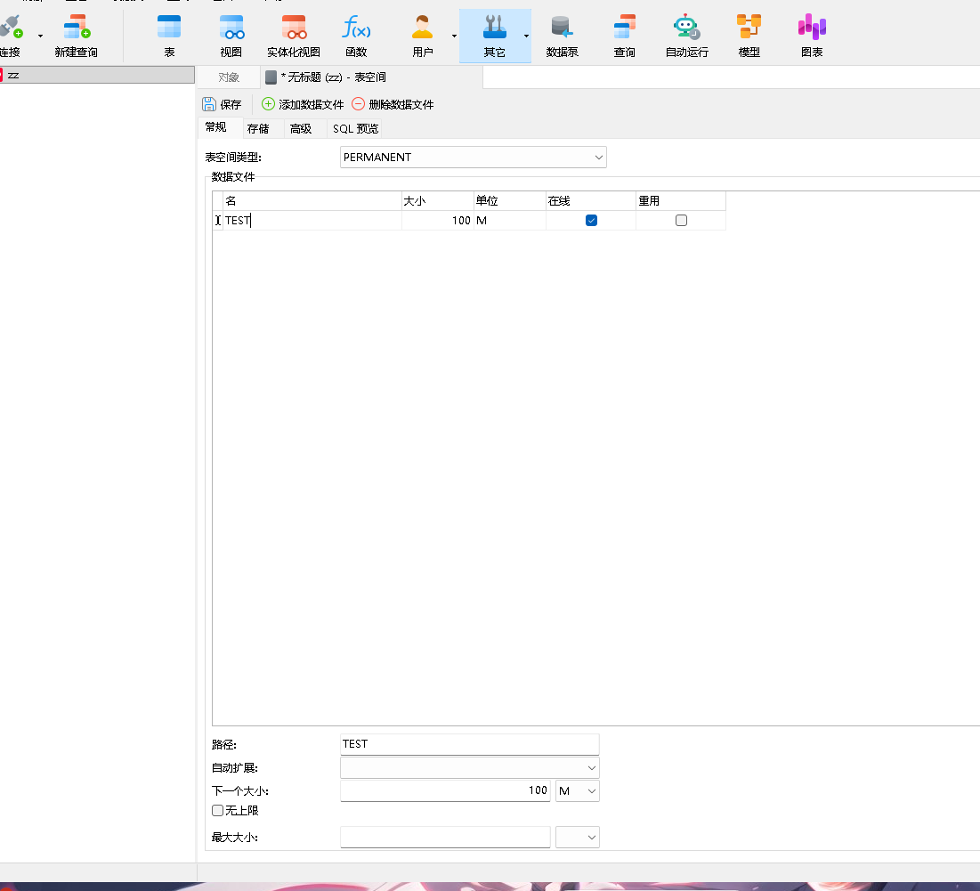 - 右键点击「表空间」→「新建表空间」