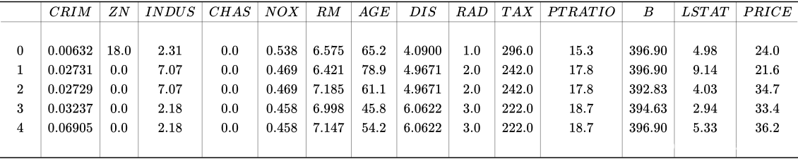 该数据集总共有 506 条数据,每条数据对应一所房屋,每所房屋包含 13 个特征,标签是各个房屋的价格。下面展示该数据集的前五条(前面 13 列为特征,最后 1 列为价格):