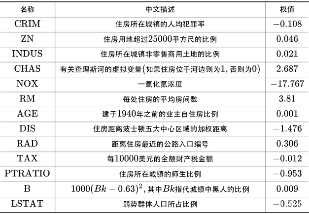 之外,其余每一项代表了房屋某个特征的权重(因为有 13 个特征没有办法可视化,通过阅读各个特征的权重也可以对该结果了解一二):