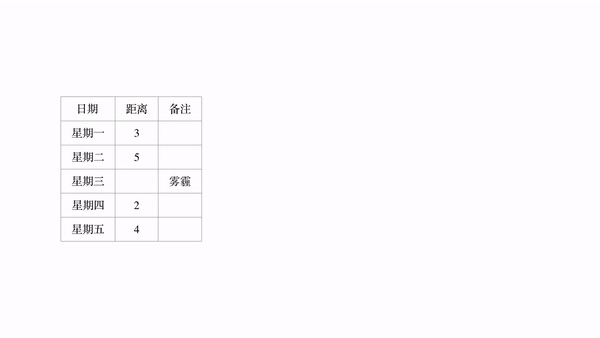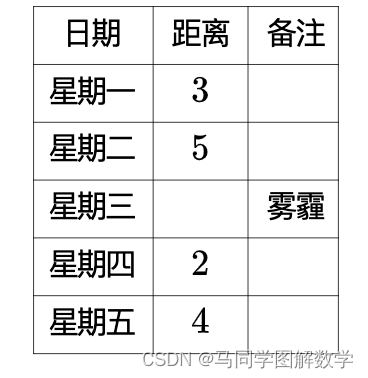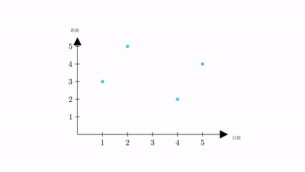下面。我们以横坐标为日期,纵坐标为距离,建立一个坐标系。然后将表格中的数据表示在坐标系中