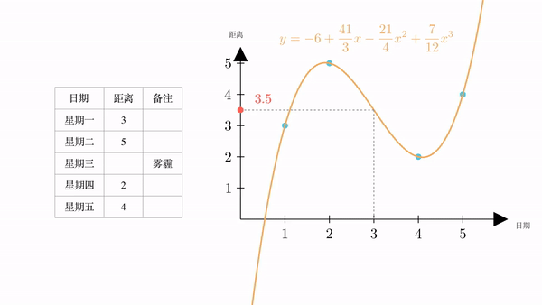 也就是说,根据插值,我们计算出星期三火星距离地球为3.5万公里