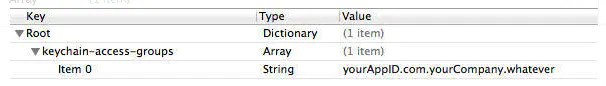 我们可以把KeyChain理解为一个Dictionary,所有数据都以key-value的形式存储,可以对这个Dictionary进行add、update、get、delete这四个操作。对于每一个应用来说,KeyChain都有两个访问区,私有区和公共区。私有区是一个sandbox,本程序存储的任何数据都对其他程序不可见。而要想在将存储的内容放在公共区,需要先声明公共区的名称,官方文档管这个名称叫“keychain access group”,声明的方法是新建一个plist文件,名字随便起,内容如下