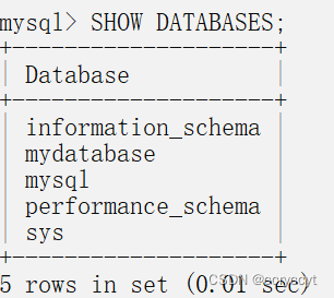 显示 MySQL 服务器上当前存在的所有数据库列表,包括系统自带的数据库和你自己创建的数据库。