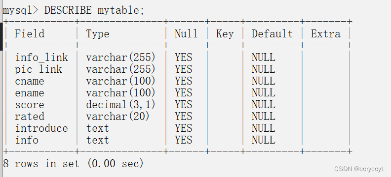 这将显示 mytable 中每个列的名称、数据类型、键信息等。