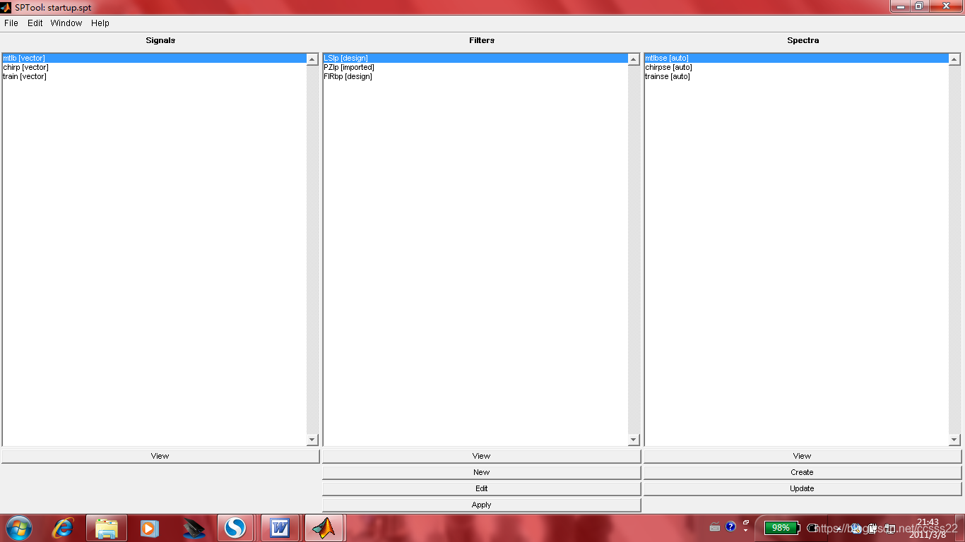 SPTool主窗口包含三个列表框:Signals列表框、Filter列表框和Spectra列表框,主窗口下部的按钮分别对应SPTool的四个信号处理功能模块。