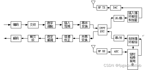 OFDM技术在接收端进行和发送相反的操作,将接收到的OFDM信号通过FFT傅里叶变换将其变为为频域信号,子载波的幅度和相位被采集出来并转换回数字信号。完整的OFDM系统的物理结构框图如图2.2所示: