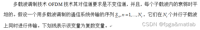 在OFDM中,整个带宽被分为N个正交子载波,每一个子载波的数据传输波特率为1/Ts,此外,相邻两个子载波之间的中心频率间隔也为1/Ts,这就实现了子载波的正交性要求。同时,使用OFDM技术,其是将N个子载波进行同时传输,即并行传输的,这样就能降低每个子载波的传输速率。所以OFDM技术可以将高速率传输变为N个低速率传输。这样还大大降低了系统接收机的实现复杂性。此外,OFDM技术也是多载波CDMA技术的基础,因此,在这里首先介绍OFDM技术。
