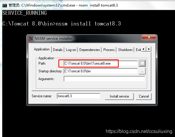 3、cmd模式进入tomcat的bin目录,输入命令:nssm install tomcat8.3(服务名,可根据需要修改)