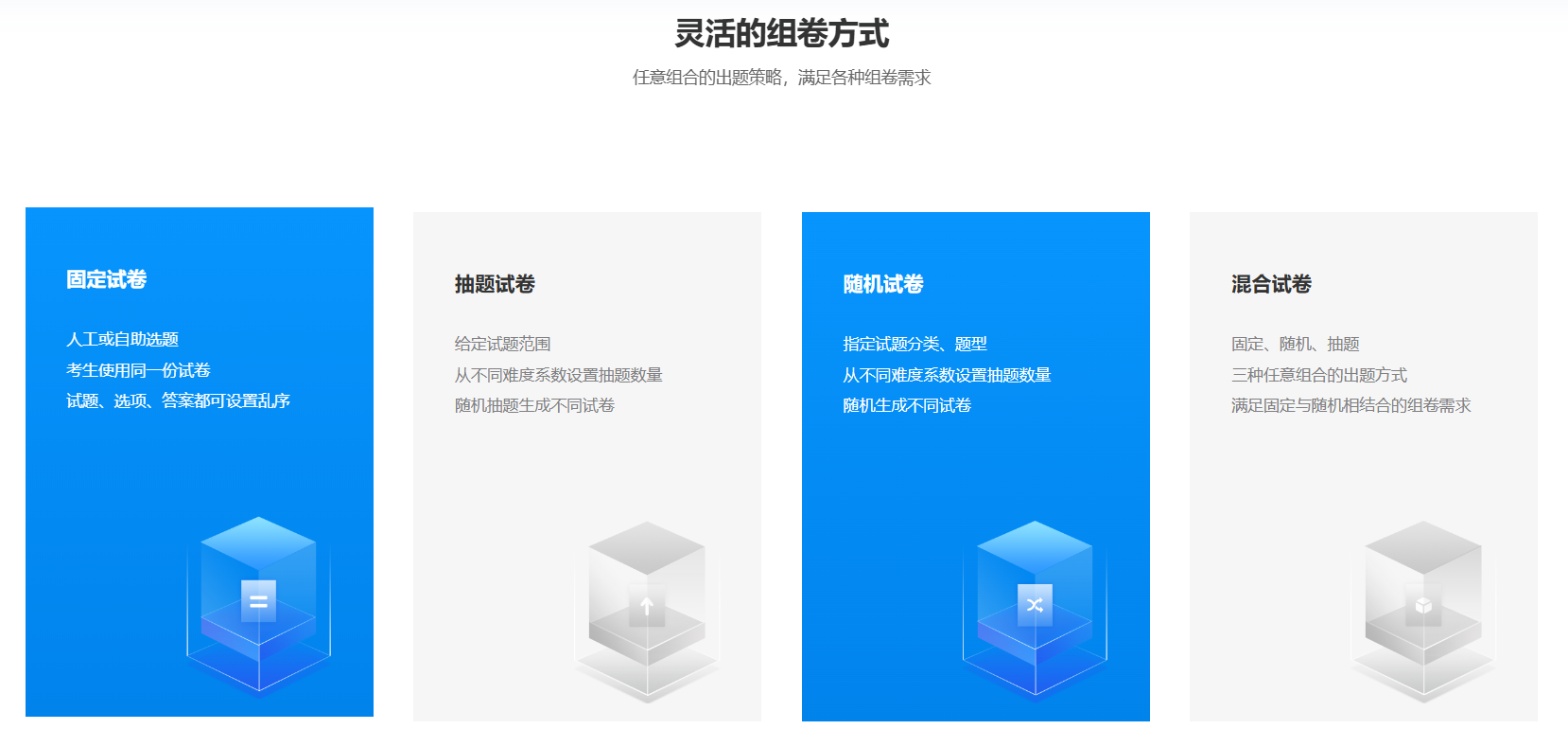 考试云支持固定试卷、随机试卷、抽题试卷三种模式,且三种模式可任意组合的出题方式,并可按章节、难度、知识点、题型等多维度组合策略出题,真正实现“千人千卷”。题库支持无限层级分类,嵌入图片、公式、音频、视频等多媒体内容,满足医学、工程、语言等专业领域需求。所有试题永久保存,无容量限制。