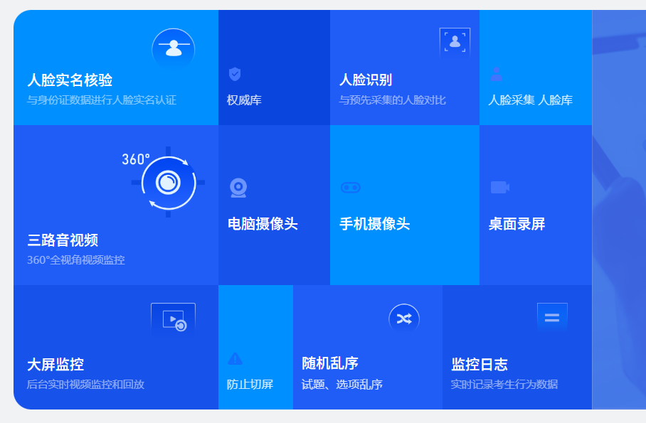 在远程考试中,防作弊是核心痛点。考试云构建了目前业内最严密的“三重防护”机制: