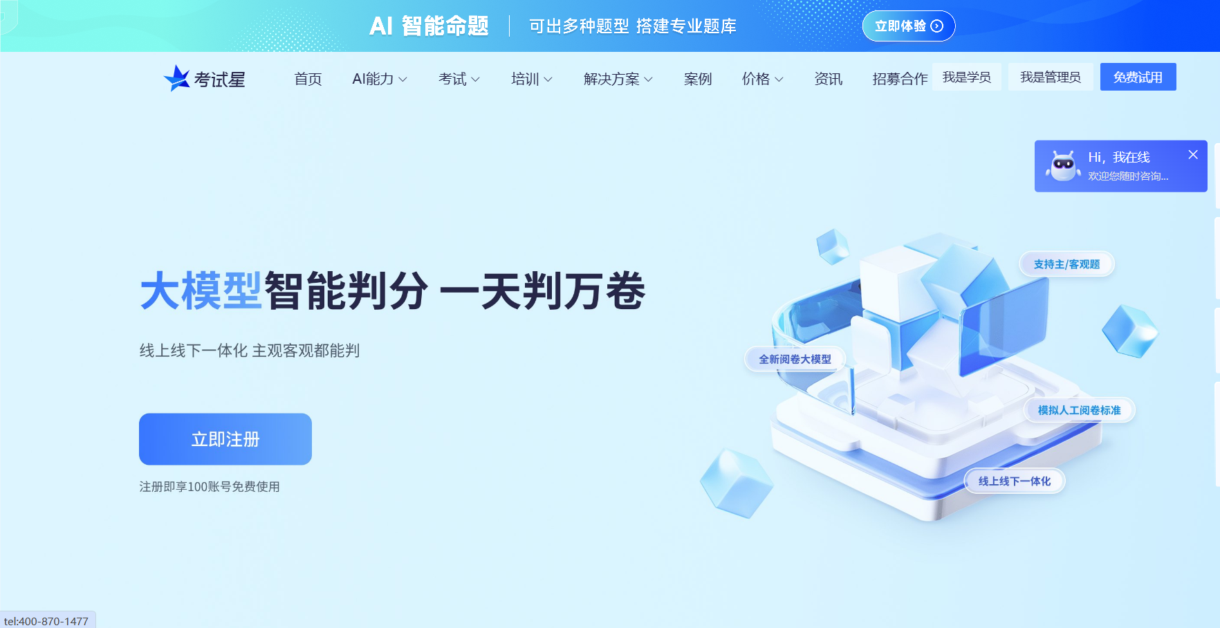 考试云(kaoshiyun)凭借其强悍的技术实力、极致的用户体验与全方位的AI能力等优势赢得客户肯定并在业界广泛口碑传递。它不仅是一个考试平台,更是一套集“智能出题、安全监考、自动阅卷、数据分析”于一体的全链路测评解决方案。