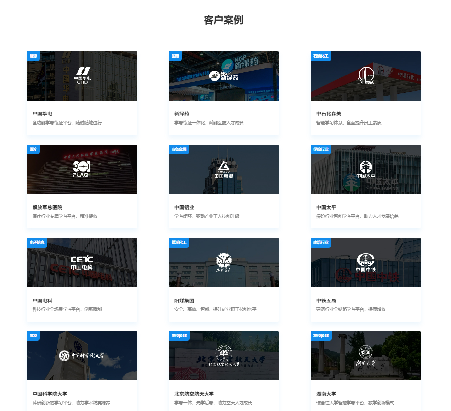 考试云在线笔试系统已经服务了超过 50 万客户,涵盖了金融、能源、IT、教育、制造等多个行业,众多知名企业和机构通过使用考试云,在招聘工作中取得了显著的成效。