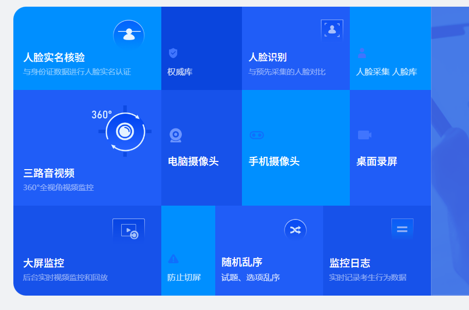 如前所述,考试云在线笔试系统的防作弊功能十分强大,构建了全方位的监控体系,有效杜绝作弊行为。除了人脸实名核验、双机位监控、三路音视频监控外,还有以下重要的防作弊功能: