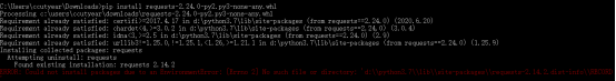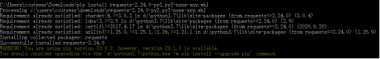 咋们可以这么想在通过.whl文件安装的过程中需要用到更高版本的requests库(当时,我的版本是requests 2.14。),所以在此时就会自动替你更新出更高版本的requests库。但是,却因为某种原因失败了。所以,我们只需要提前安装上更高版本的requests库就行了。