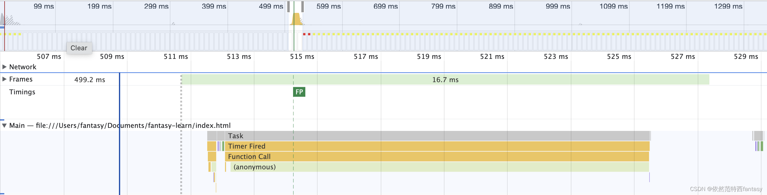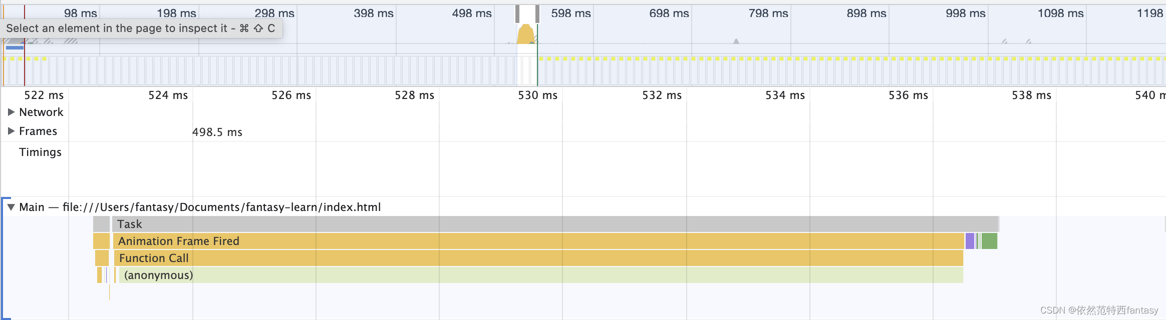 二者的区别就在于:rAF是将所有的效果都推迟了一帧,最终展示bgColor为yellow;setTimeout则是会在第二帧展示red,第二帧以后展示yellow。