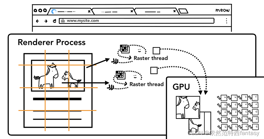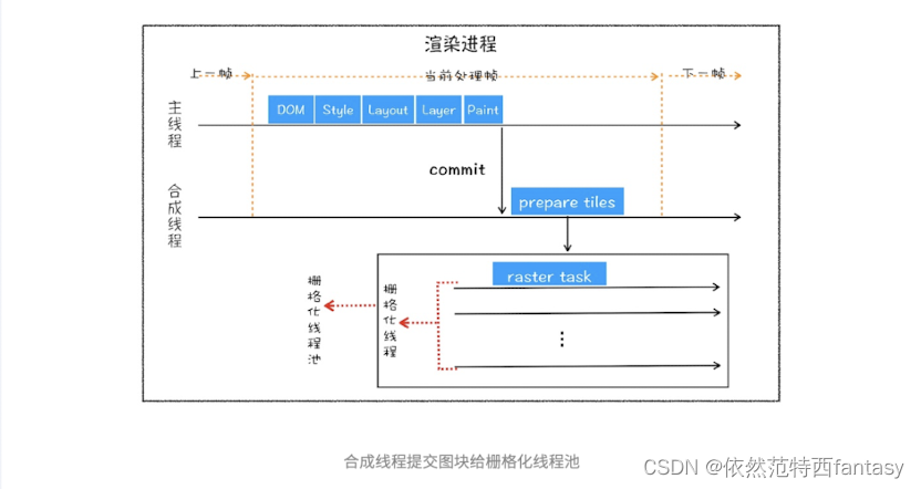 当图层的绘制列表准备好之后,主线程就会把该绘制列表提交给合成线程。合成线程会将内容划分成图块后发送给栅格线程进行栅格化操作。所谓栅格化,是指将图块转换为位图。实际生成位图的操作是由栅格化来执行的,所处理位图的视图优先级决定了栅格化线程的优先级。渲染进程维护了许多栅格化线程,所有图块的栅格化都是在线程池内执行的。