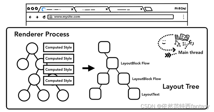 计算出DOM树中可见元素的几何位置,这个计算过程就叫布局。主线程会遍历 DOM 树和样式,然后构造出一颗布局树。 这棵树上的节点都带有 x、y 坐标和边界框大小之类的信息。布局树和 DOM 树的结构类似,但是树上只包含页面可见元素的信息。如果元素被设置了 display: none,那么布局树就不会包含这个元素。同样的,如果一个内容是通过伪类(比如 p::before { content: 'Hi!' })添加进来的,那么这个元素会被包含在布局树中,但是 DOM 树中没有。