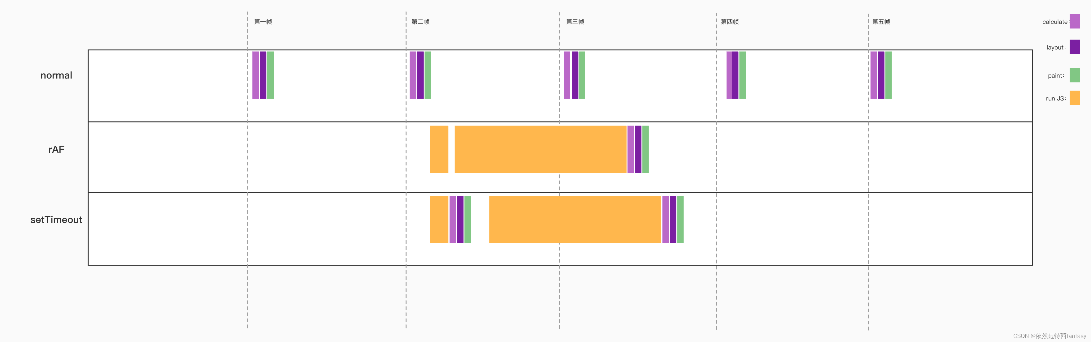 rAF一定会在paint之前执行。或许其task的占用时间会很长,但是导致的现象为原本应该出现在第二帧的内容,被推迟到第三帧才绘制完成,最终展示;而setTimeout则不会有这种特性。当setTimeout的task时间过长时,浏览器会优先将这一帧的内容paint完成,而setTimeout的任务则被推到paint之后执行。